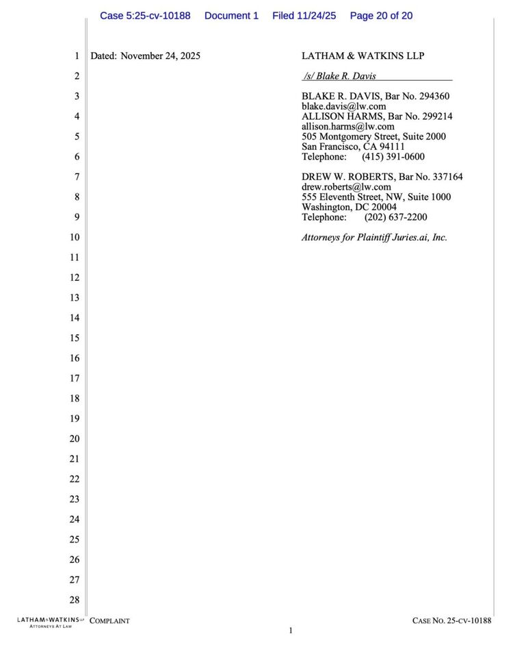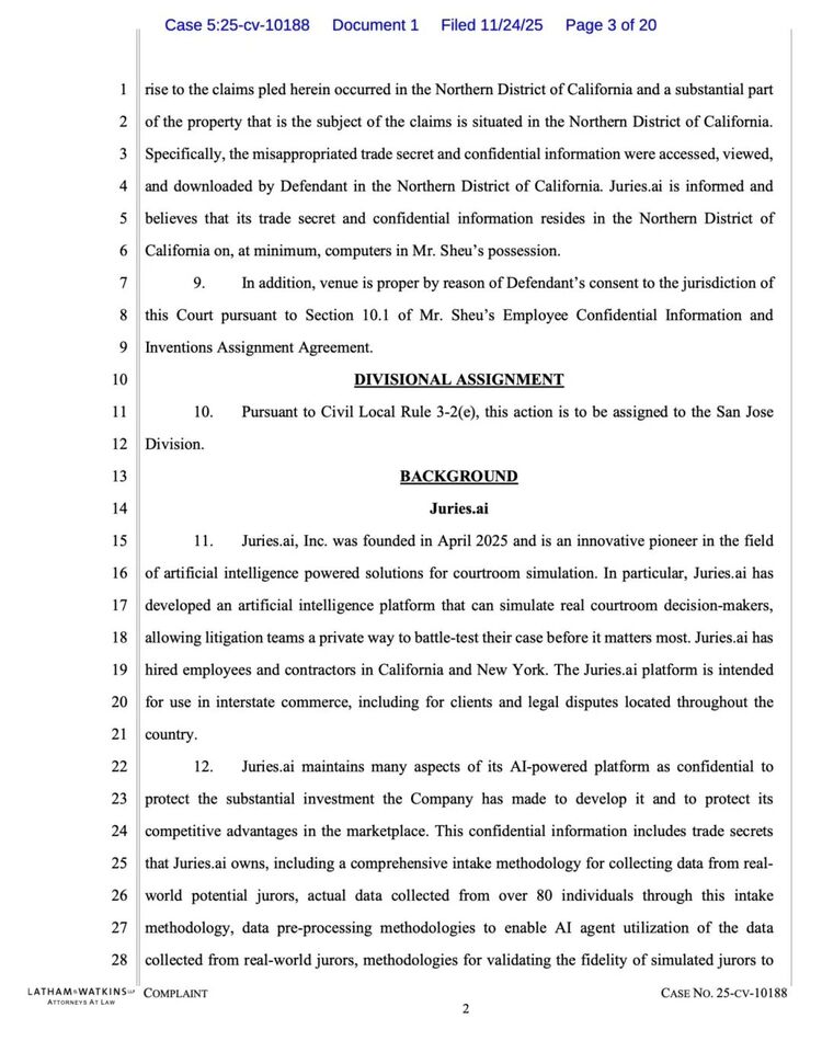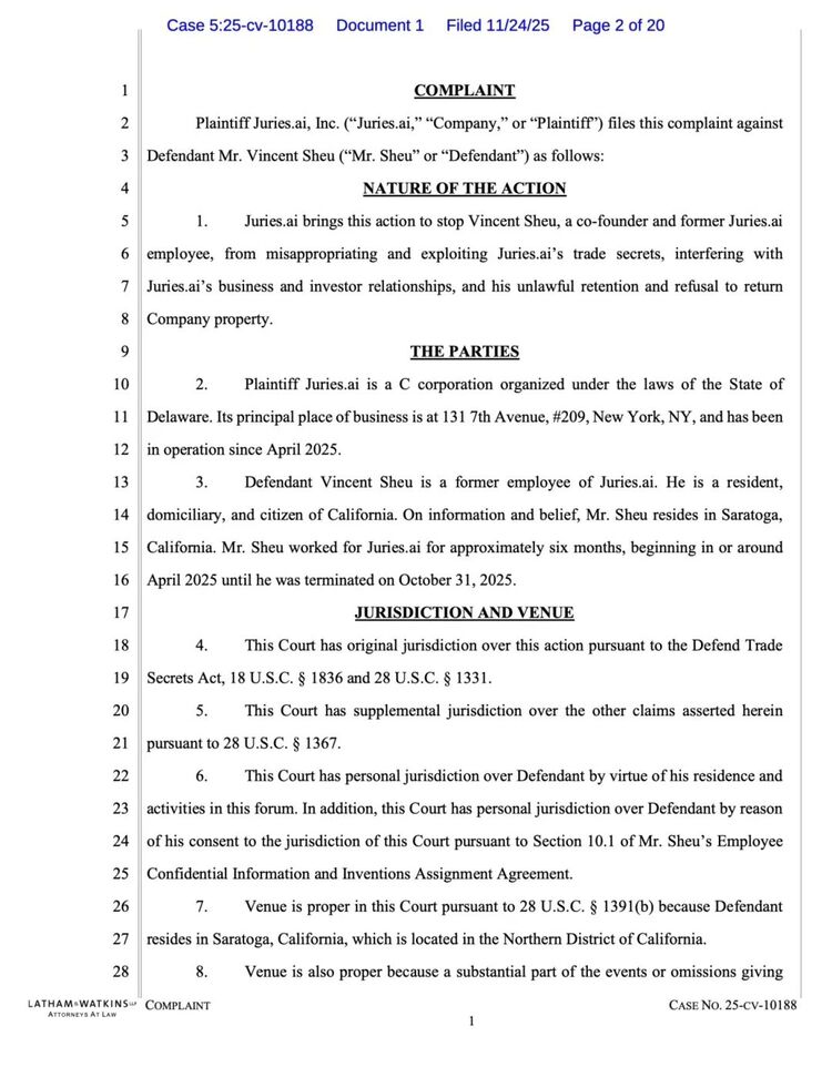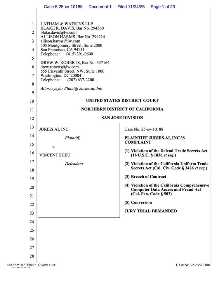 本案案号为Juries.ai Inc v. Sheu,美国加州北区联邦地区法院,案件编号5:25-cv-10188。