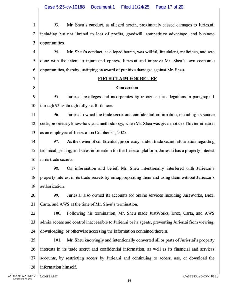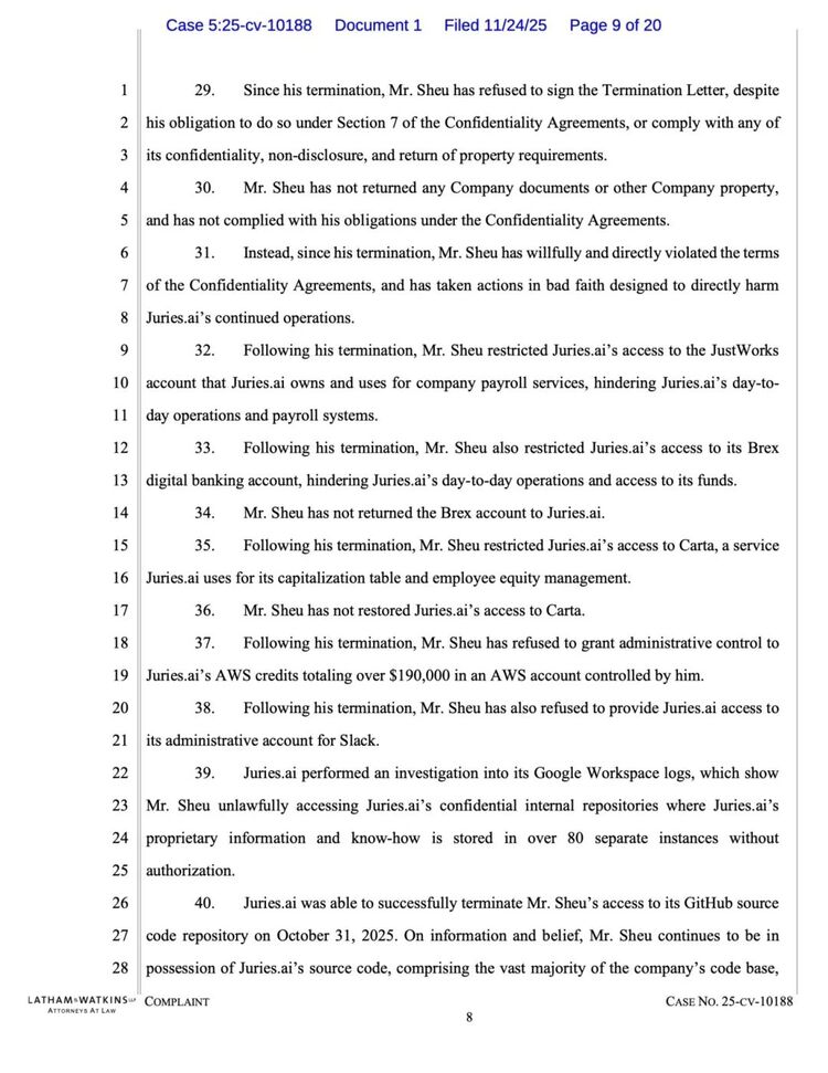 诉讼称这家初创公司于10月解雇了Vincent Sheu,并指出"尽管Vincent Sheu自称是能够构建Juries.ai平台的AI专家,但他对Juries.ai产品的推进并未作出实质性贡献"。