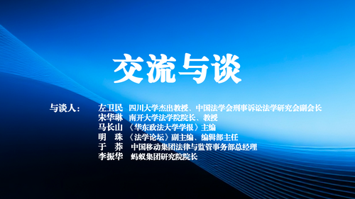 在与谈环节,四川大学法学院左卫民教授、南开大学法学院院长宋华琳教授等学界代表,与《华东政法大学学报》主编马长山,《法学论坛》副主编、编辑部主任明珠等期刊编辑代表,以及中国移动集团法律与监管事务部总经理于莽、蚂蚁集团研究院院长李振华等行业实务专家就十大议题发布的意义与衍生价值展开深度交流与思想碰撞,进一步丰富了议题的内涵与外延。