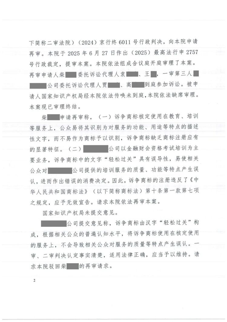 柴某不服国家知识产权局维持诉争商标注册的裁定,提起诉讼。在经历一审、二审败诉后,向最高人民法院申请再审。最高人民法院于2025年6月27日裁定提审本案。
