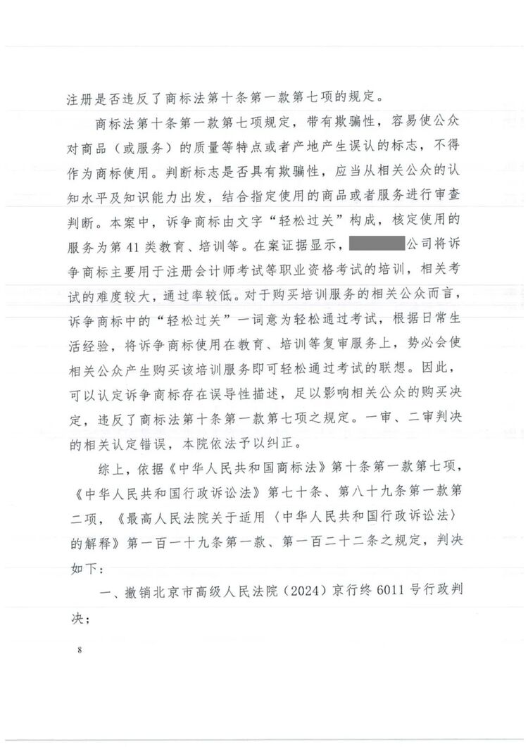 最高人民法院认定,“轻松过关”作为商标使用在教育、培训等服务上,具有误导性描述,容易使相关公众对服务质量产生误认,违反《商标法》第十条第一款第七项关于“带有欺骗性”标志不得作为商标使用的规定。该判决进一步厘清了“欺骗性”商标的司法认定标准,对规范教育培训行业商标注册与使用具有重要指导意义。