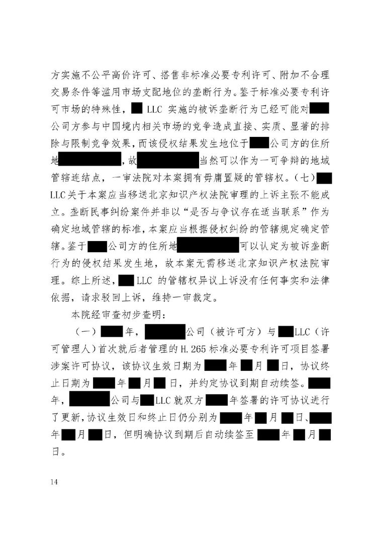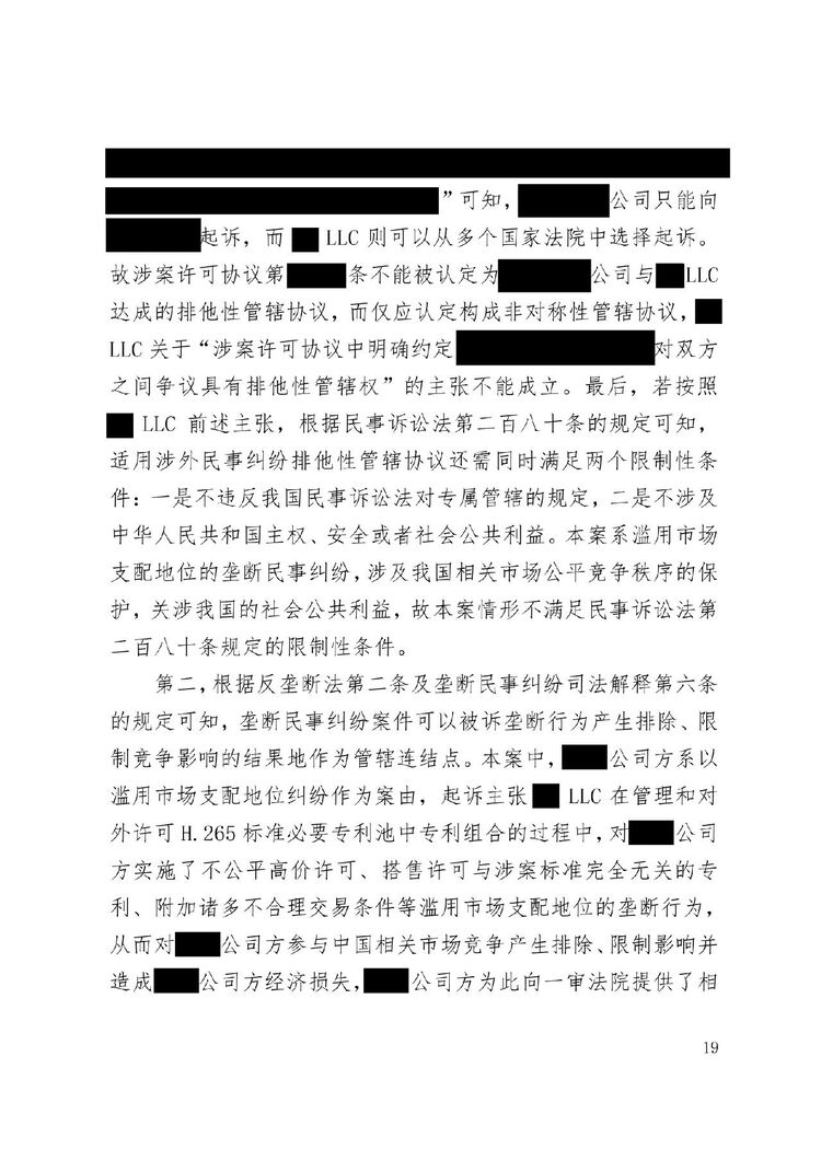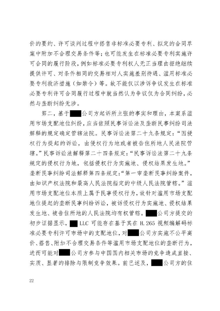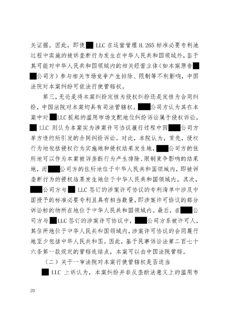 被上诉方系中国国内知名企业,主要从事相关技术产品业务。美国LLC是一家依据美国法律成立的专利许可管理公司,负责管理H.265视频编解码标准必要专利池的许可事务。