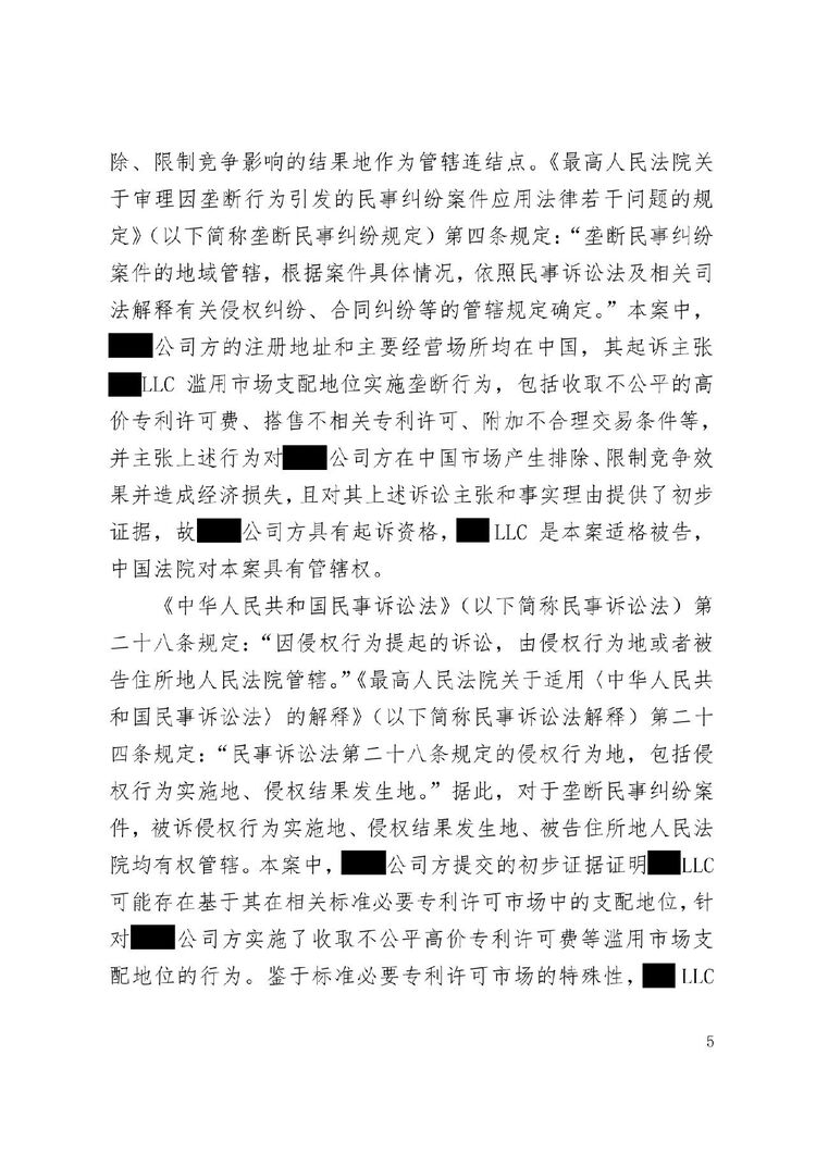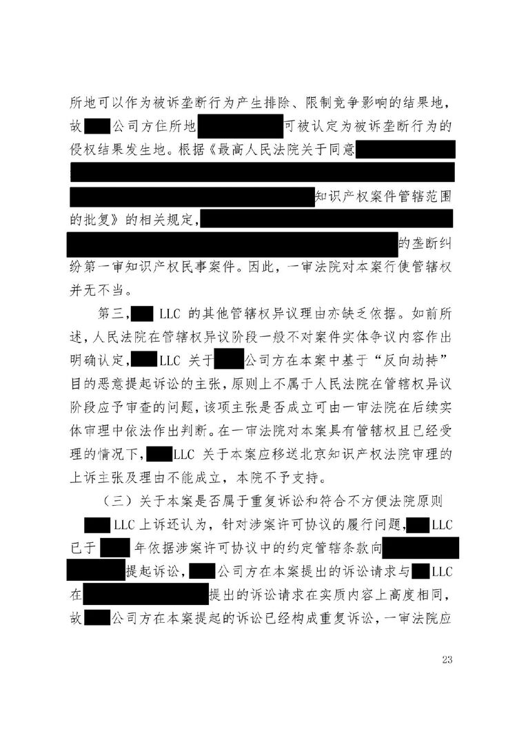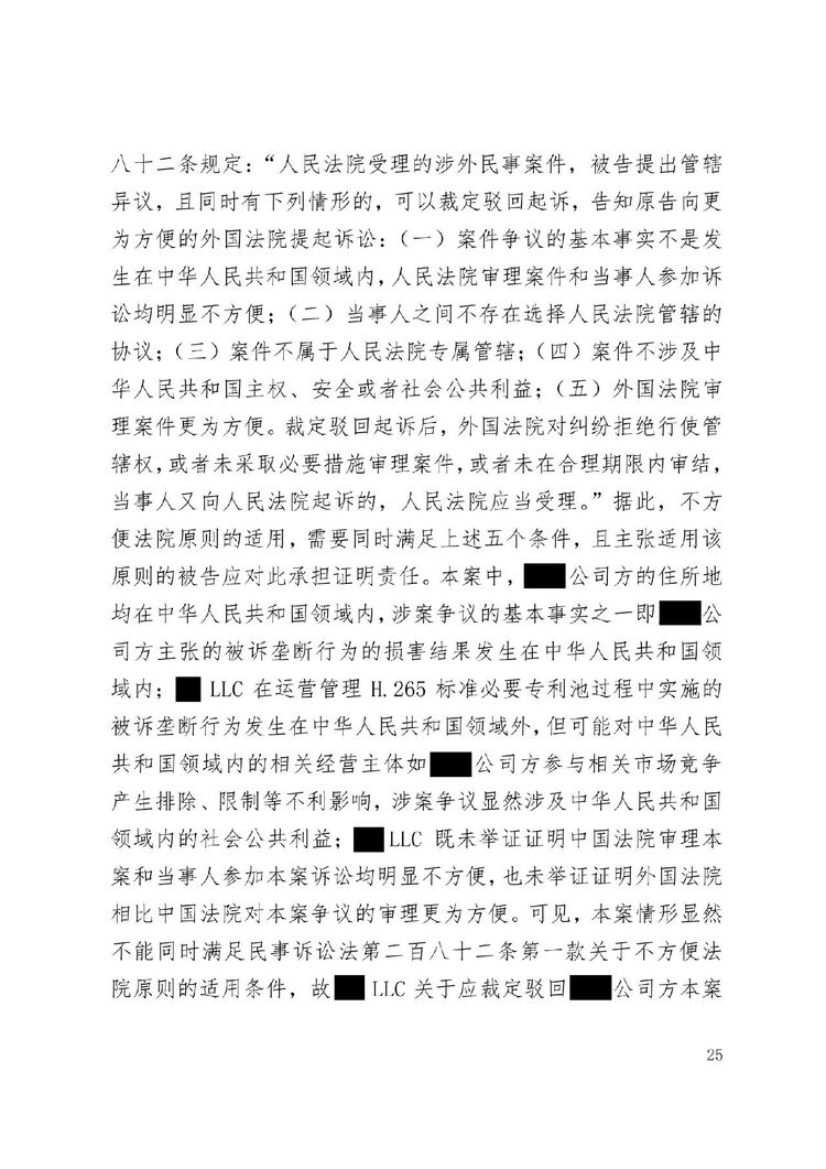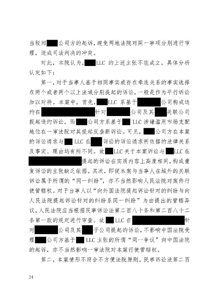 2、本案不符合“不方便法院原则”。该原则的适用须同时满足《民事诉讼法》第二百八十二条规定的五项条件,且由主张方承担举证责任。本案被诉垄断行为的损害结果发生在中国,涉及中国市场竞争秩序与社会公共利益,且美国LLC未举证证明中国法院审理明显不便或外国法院审理更为便利。因此,其主张不能成立。