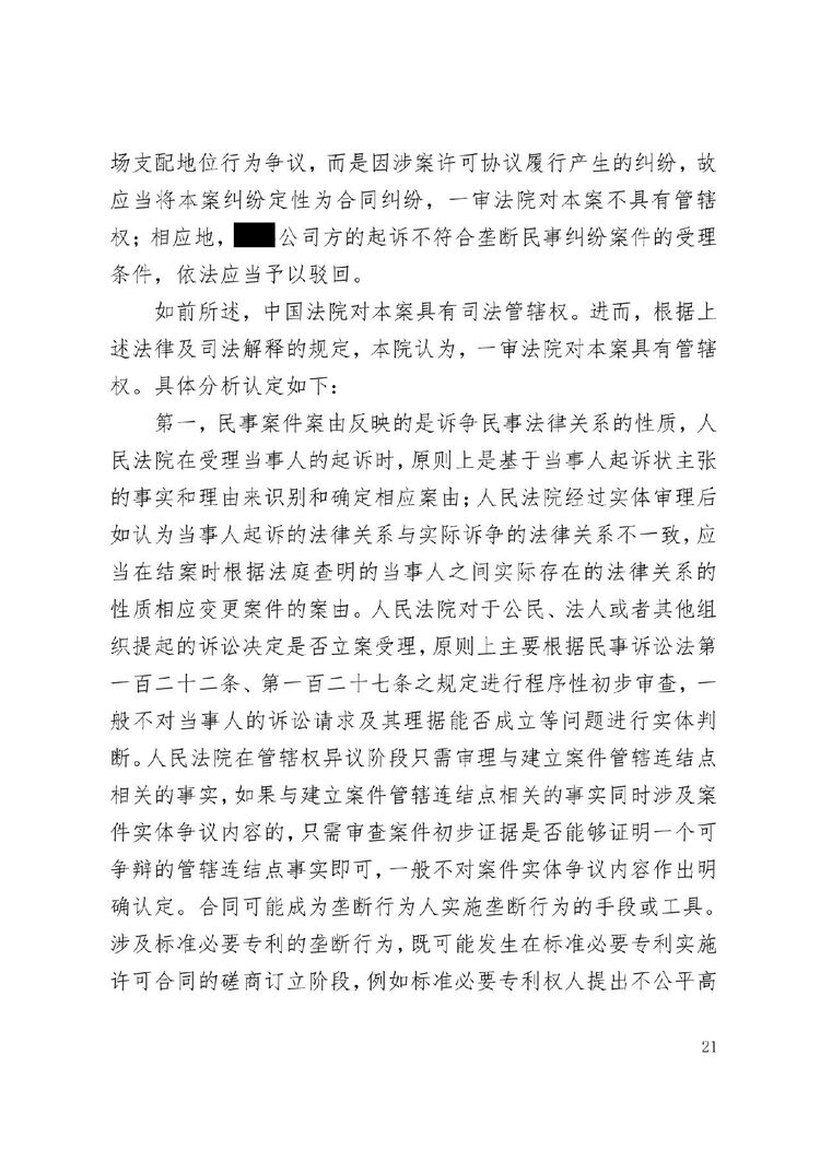 争议发生于标准必要专利许可合同履行过程中,并不意味其仅为合同纠纷而必然排除垄断纠纷的可能。基于一审原告方起诉所主张的事实和理由,本案案由为滥用市场支配地位纠纷,属于侵权纠纷,应依侵权行为地或被告住所地确定管辖。一审原告的住所地系被诉垄断行为产生排除、限制竞争影响的结果地,可作为侵权结果发生地,故一审法院依法对辖区内垄断纠纷具有一审管辖权。