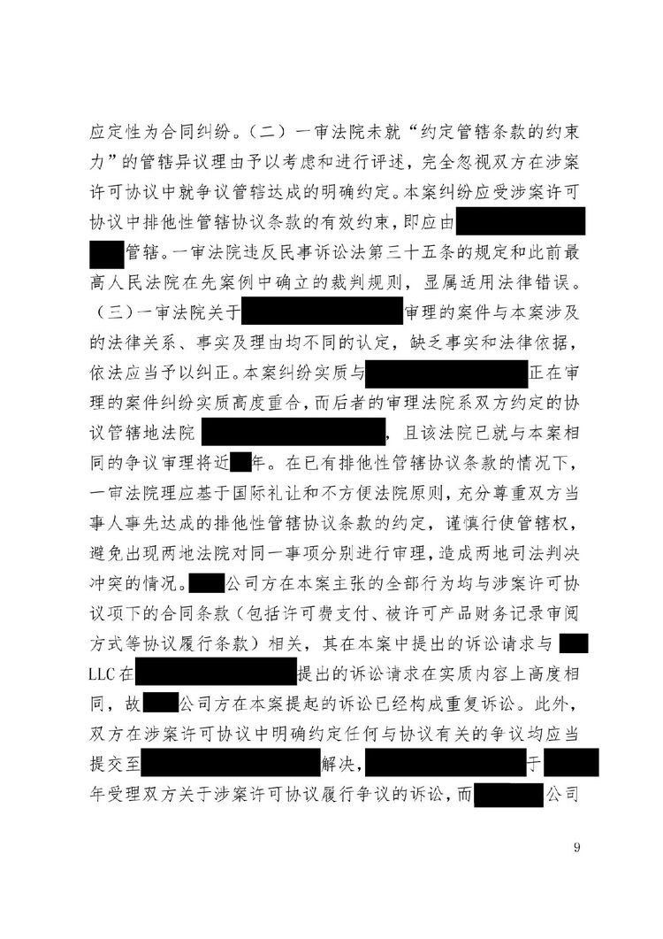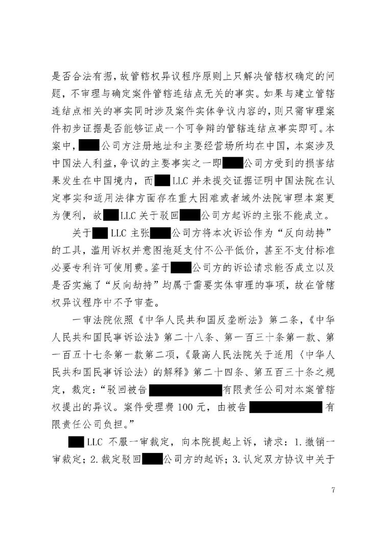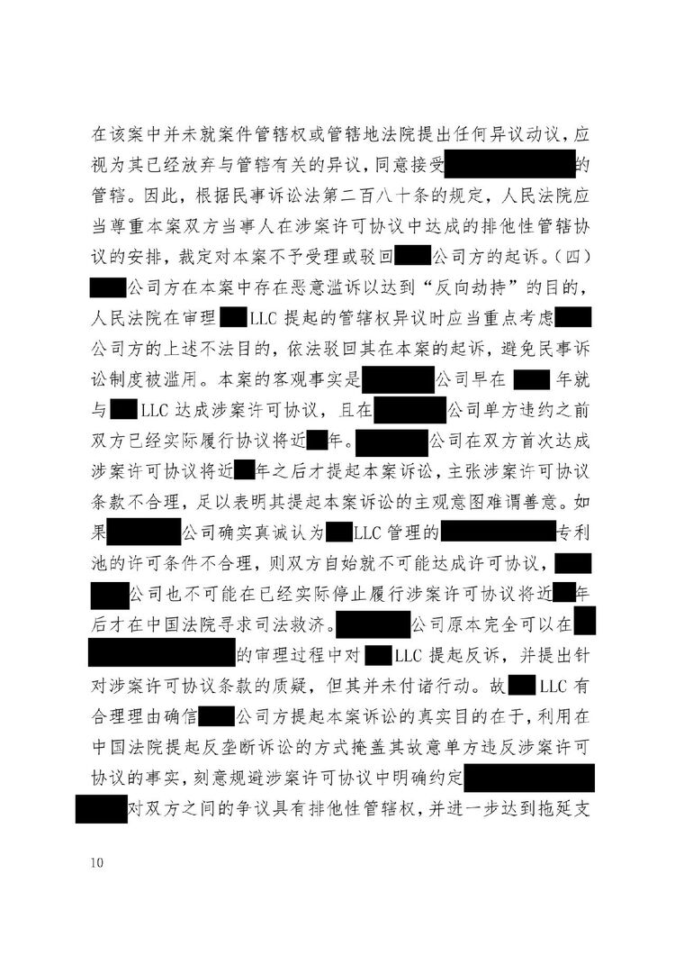 美国LLC在提交答辩状期间对管辖权提出异议,核心理由是:本案实质是因履行双方《专利组合许可协议》产生的合同纠纷,而非垄断纠纷;该许可协议中已约定了争议解决管辖法院(某外国法院),且美国LLC已在该外国法院针对中国公司方提起了合同违约诉讼,两家中国公司未对管辖提出异议,应视为接受该外国法院管辖。因此,中国法院不应受理本案,或应驳回起诉,或将本案移送至北京知识产权法院审理。
