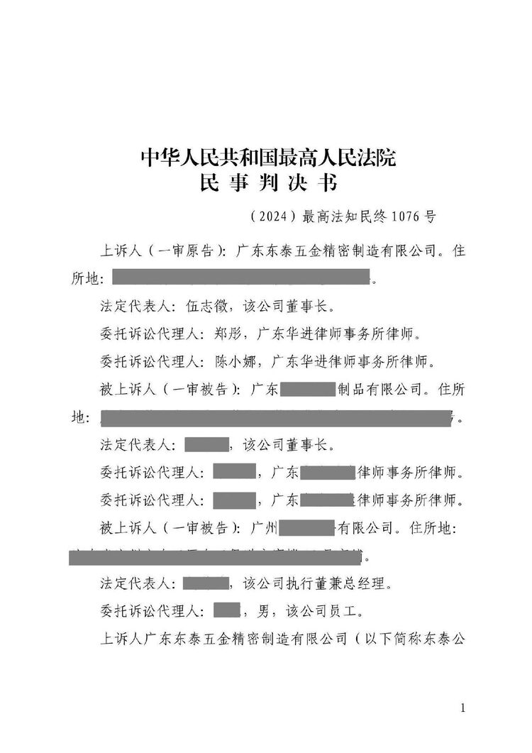 知产财经获悉,近日,最高人民法院(下称“最高法”)同时就广东东泰五金精密有限公司(下称“东泰公司”)与广东泰某金属制品有限公司(下称“泰某公司”)侵害发明专利权纠纷上诉【案号:(2024)最高法知民终1075号和1076号】两案作出终审判决,双双撤销一审判决,予以改判。其中,
