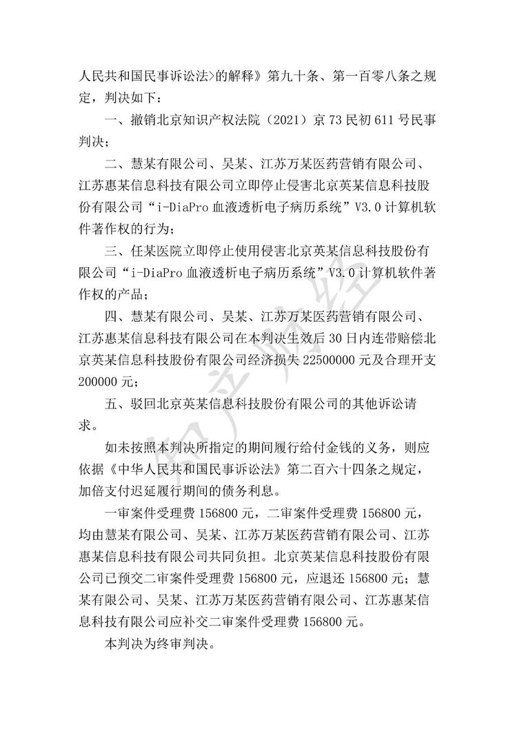 知产财经获悉,近日,最高人民法院就上诉人北京英某信息科技股份有限公司(以下简称“英某公司”)与被上诉人慧某有限公司(以下简称“惠某公司”)、吴某、江苏万某医药营销有限公司(以下简称“万某公司”)、任某医院等侵害计算机软件著作权纠纷一案作出二审判决。