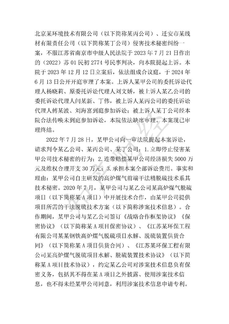 北京某科技股份有限公司是一家从事环保技术研发和设备制造的公司,拥有高炉煤气前端干法净化工艺技术。2020年7月,北京某科技股份有限公司与江苏某环保工程有限公司就某钢厂高炉煤气净化项目(以下简称某A项目)展开合作。双方签订了《战略合作框架协议》《某A项目设备供货合同》及《保密协议》,约定北京某科技股份有限公司向江苏某环保工程有限公司提供其干法净化工艺的相关技术信息,并要求江苏某环保工程有限公司对该技术信息承担保密义务,不得向第三方披露或使用。