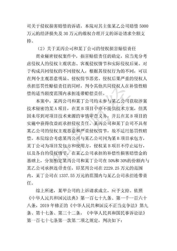 二、江苏某环保工程有限公司于本判决生效之日起三十日内赔偿北京某科技股份有限公司经济损失5000万元及维权合理开支30万元,北京某环境技术有限公司、迁安市某线材有限责任公司分别在2229.25万元和1337.55万元范围内承担连带赔偿责任;