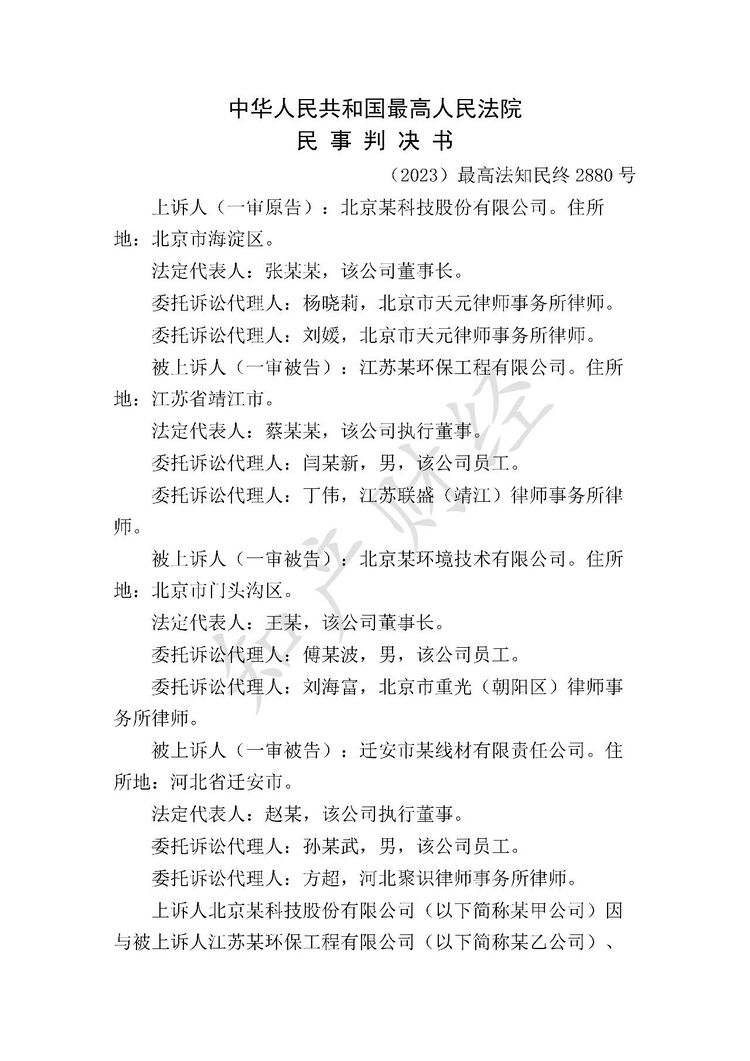 但是,某B项目合同金额高达30876万元,北京某环境技术有限公司与江苏某环保工程有限公司作为共同承包方,根据合同约定,北京某环境技术有限公司能获得85.56%的高额收益,其对项目技术来源理应具有高度审慎义务。迁安市某线材有限责任公司作为项目发包方和实际使用方,当然会向项目承包方提出技术需求,并对承包方提供的项目技术方案进行审查。