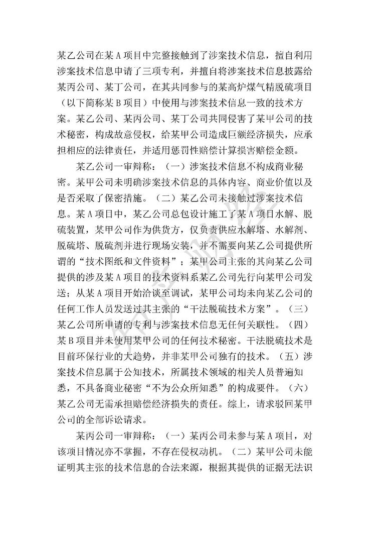 最后,关于涉案技术信息的价值性。本案中,北京某科技股份有限公司(甲方)与江苏某环保工程有限公司(乙方)在某A项目中签订的《战略合作框架协议》明确约定:“甲乙双方发挥各自技术优势和市场优势,在高炉煤气前端干法脱硫技术领域,建立长期稳定、互信互利的战略合作关系……项目合作过程中,甲方提供技术支持和项目方案,乙方利用自身信息渠道和业主关系,全力促成项目推广落地。”某A项目使用了北京某科技股份有限公司提供的涉案技术信息,其合同总价为766万元,北京某科技股份有限公司指控侵权的某B项目合同总价更是高达30876万元。显然,涉案技术信息作为脱硫环保项目的核心技术,符合反不正当竞争法关于商业秘密“具有商业价值”的构成要件,具有价值性。
