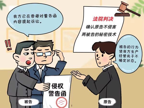 法院经审理认为,香港与内地属于两个法域,虽然被告在香港针对警告函内容提起了诉讼,但并不能消除原告在内地经营的不稳定状态,故根据相关法律规定,原告的起诉行为符合确认不侵权诉讼的受理条件,本案证据亦不能证明原告侵害了被告侵权警告函所主张的技术秘密,法院据此判决确认原告不侵害两被告的技术秘密。判决后,当事人未提起上诉,判决已发生法律效力。