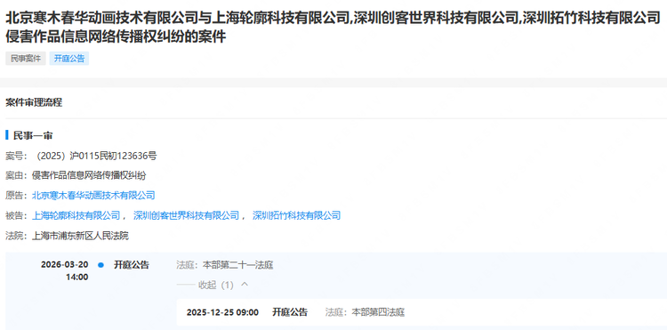 企查查显示,此前,《罗小黑战纪》的版权方(著作权人)北京寒木春华动画技术有限公司也曾因“侵害作品信息网络传播权”向拓竹科技等三家公司提起诉讼,目前案件已进入民事一审,该案将于3月20日开庭。