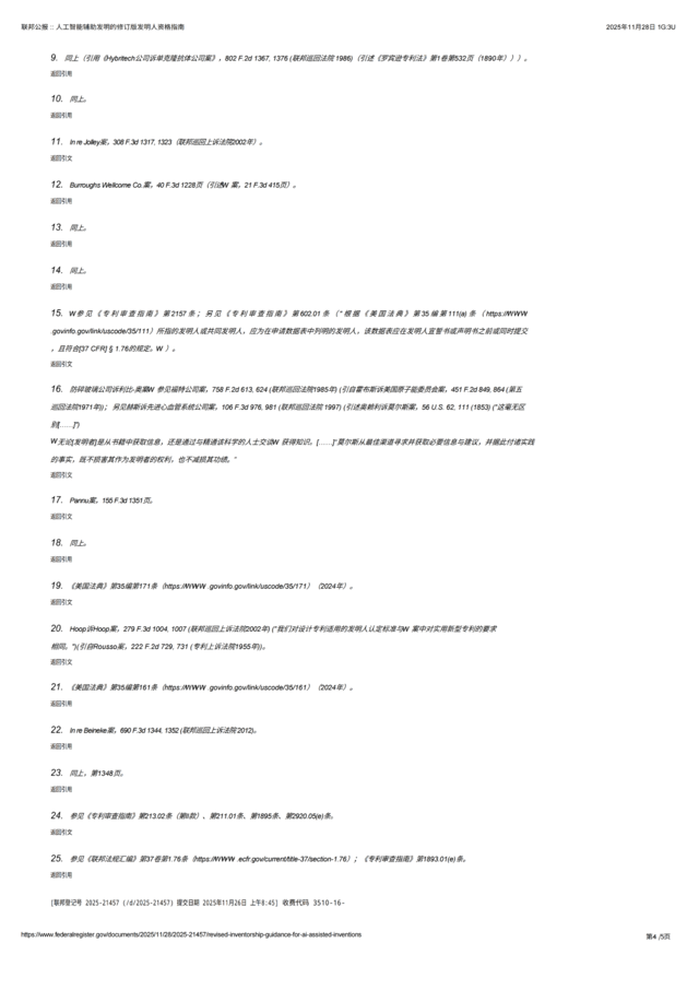 知产财经从Reuters获悉,2025年11月26日,美国专利商标局(USPTO)发布最新指南,明确规定:即便发明过程中运用了生成式人工智能(AI)系统,AI仅应被认定为辅助工具(类同实验室设备、软件、数据库等),不得被列为发明人;合法发明人仅限于对发明构思作出实质性贡献的主体,即自然人。