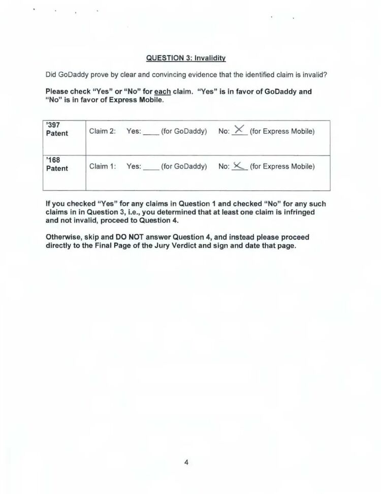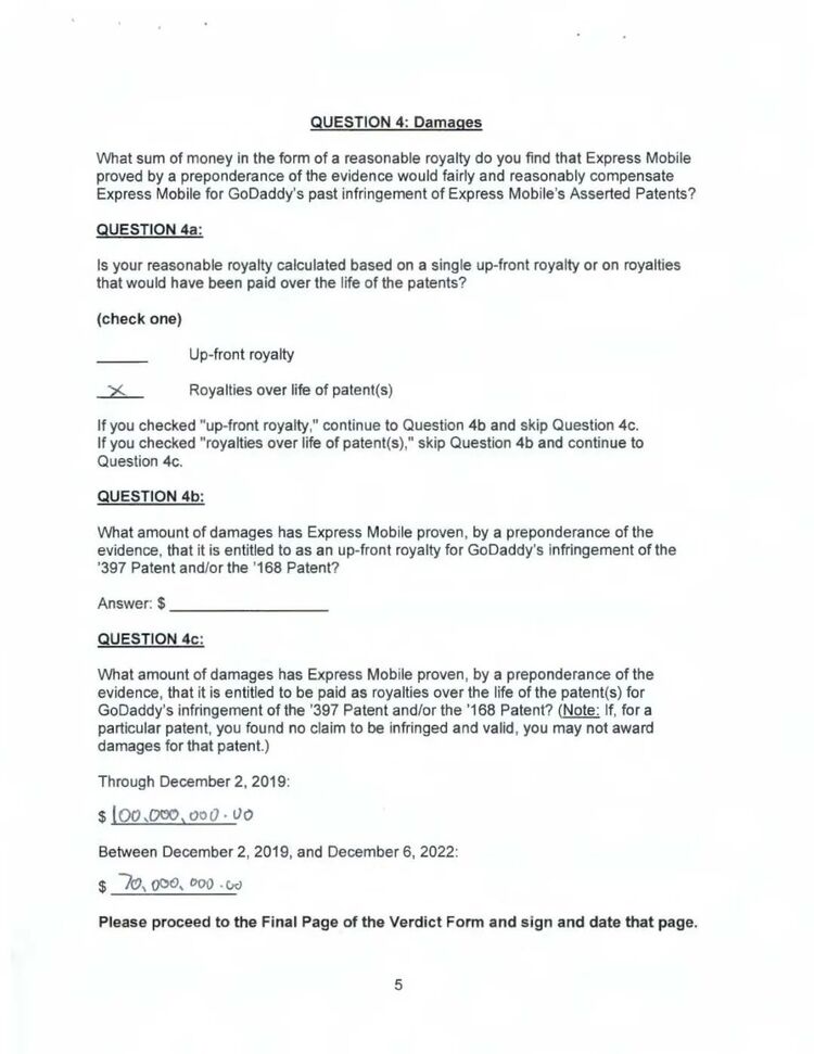 经审理,陪审团认为,GoDaddy确实侵犯了Express Mobile两项专利('397专利第2项权利要求和'168专利第1项权利要求),且该侵权行为属于故意侵权;同时,GoDaddy未能提供有力证据证明涉案专利无效。因此,陪审团裁定GoDaddy需就其持续的侵权行为向Express Mobile支付总计1.7亿美元的赔偿,其中7000万美元是针对2019年12月2日至2022年12月6日期间的专利许可费。