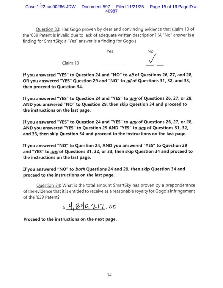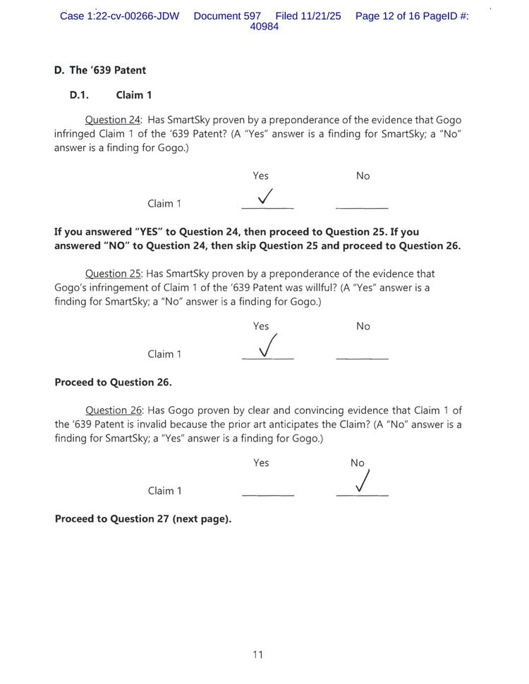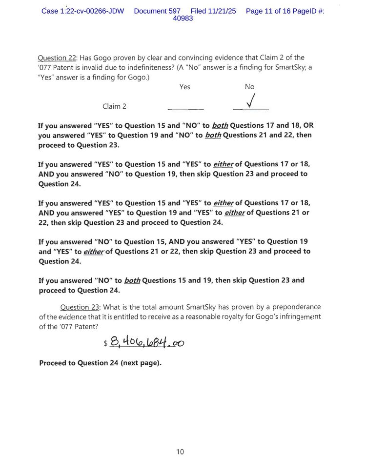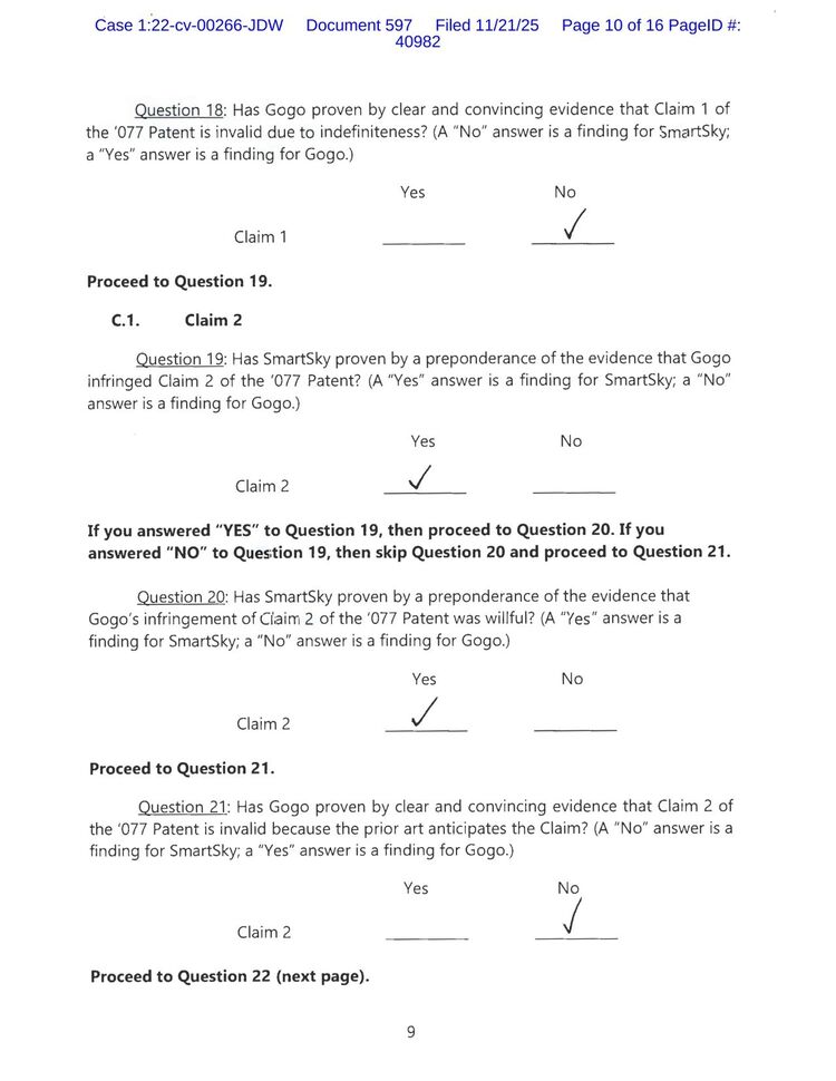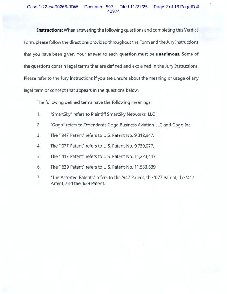 此专利纠纷最早由SmartSky于2022年提起,核心争议在于Gogo推出的5G ATG网络是否侵犯了SmartSky的专利技术。被认定侵权的专利涉及SmartSky的多项关键技术,包括地面发射/接收系统(ground-based transmissions)及其在机上Wi?Fi服务中的应用。2024年初,法院曾拒绝SmartSky对Gogo的临时禁令申请,因此Gogo得以继续部署其网络服务。陪审团最终裁定Gogo的行为构成故意侵权,并判赔2270万美元。