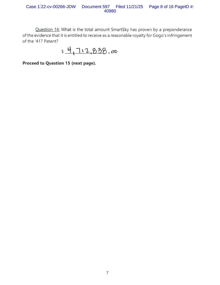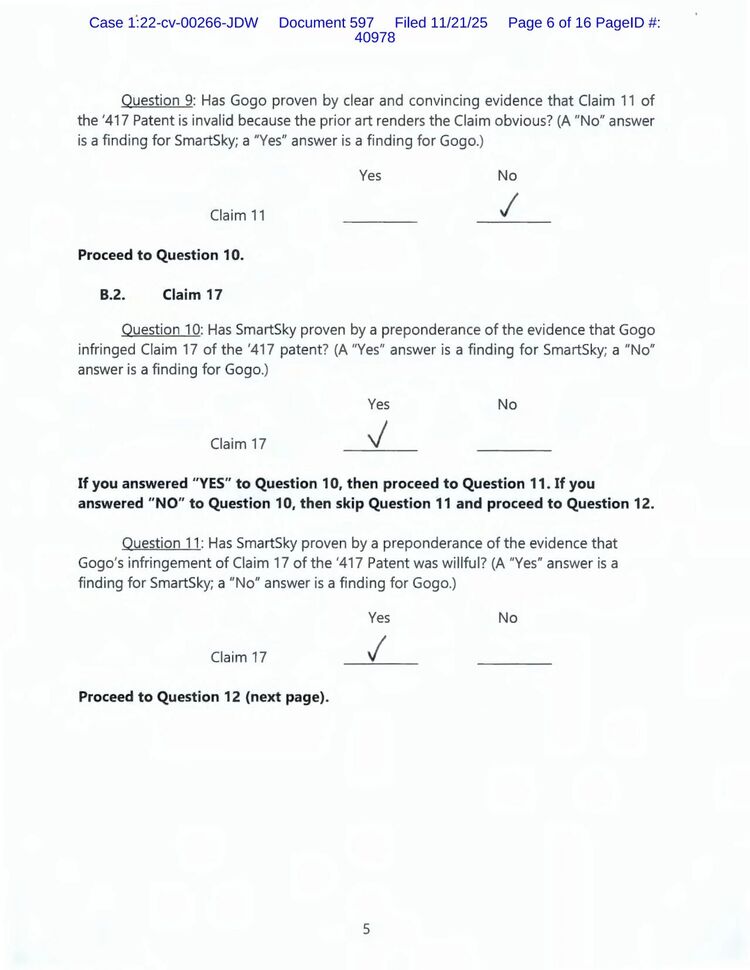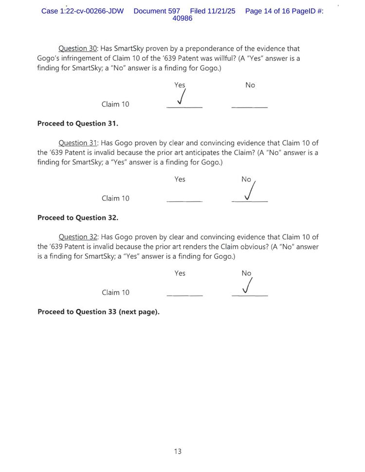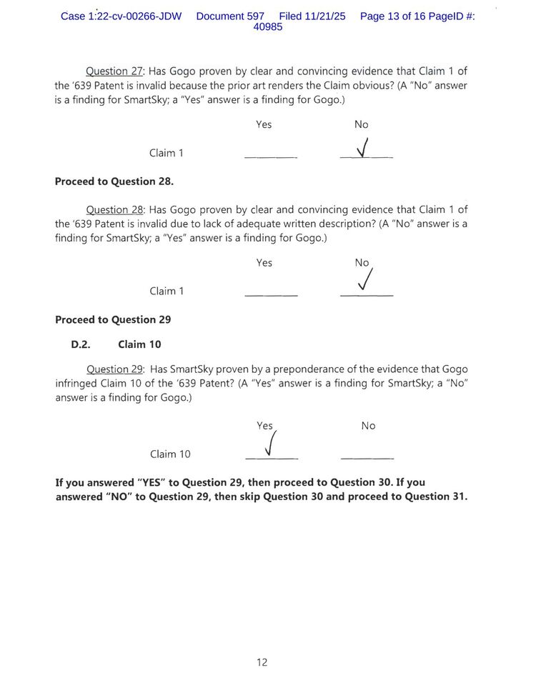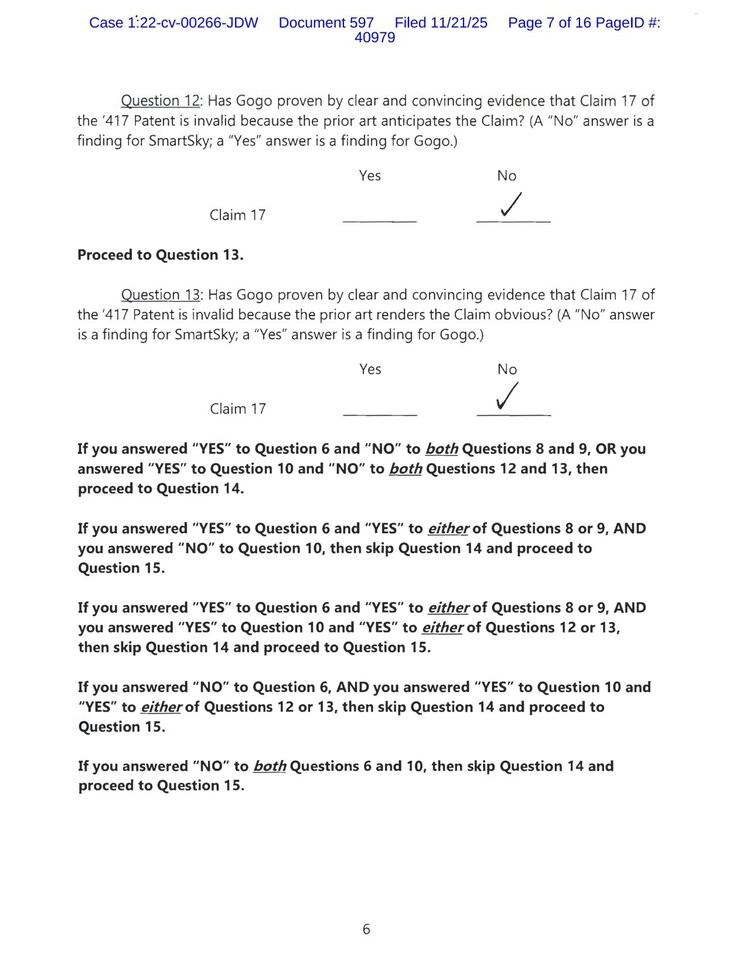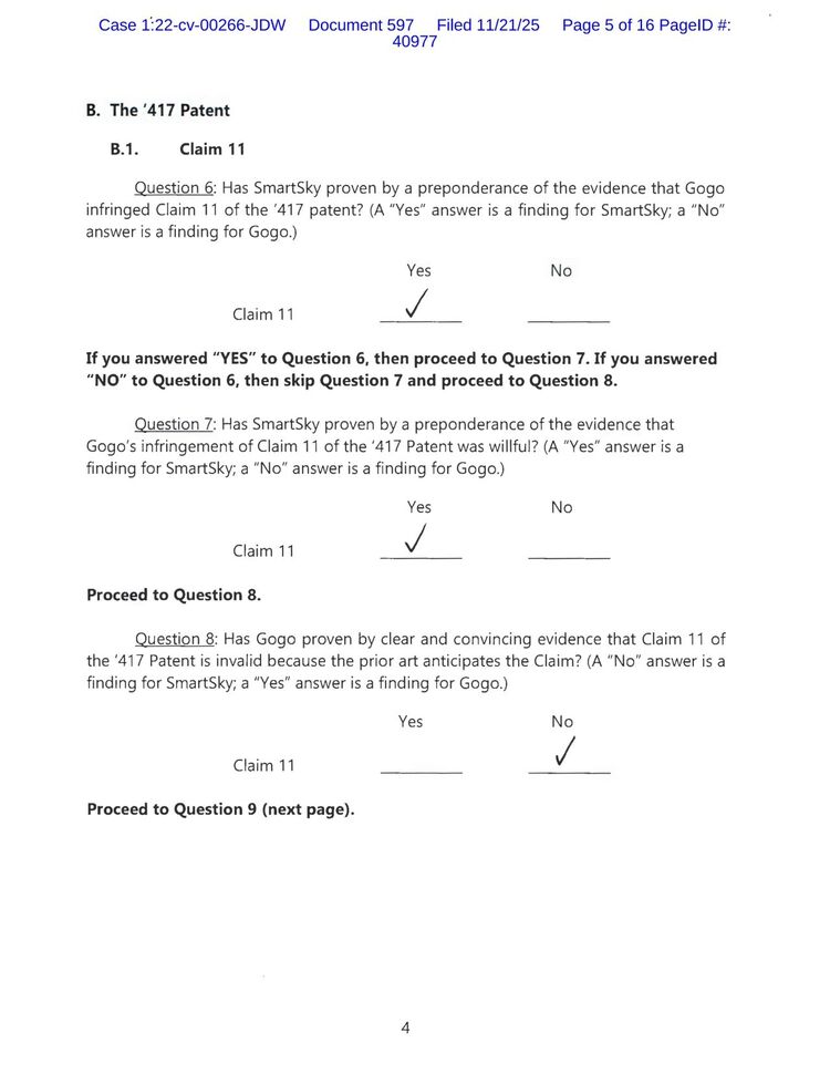此专利纠纷最早由SmartSky于2022年提起,核心争议在于Gogo推出的5G ATG网络是否侵犯了SmartSky的专利技术。被认定侵权的专利涉及SmartSky的多项关键技术,包括地面发射/接收系统(ground-based transmissions)及其在机上Wi?Fi服务中的应用。2024年初,法院曾拒绝SmartSky对Gogo的临时禁令申请,因此Gogo得以继续部署其网络服务。陪审团最终裁定Gogo的行为构成故意侵权,并判赔2270万美元。
