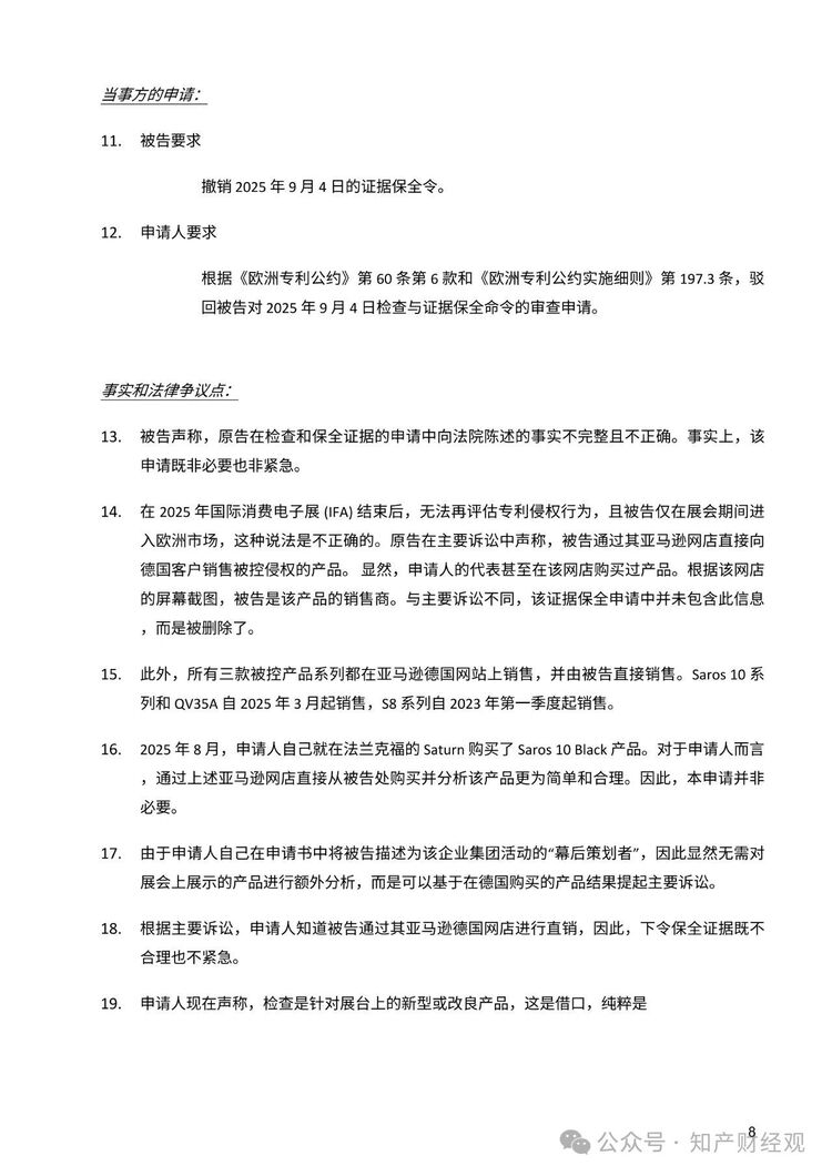 2025年9月4日,UPC杜塞尔多夫地方分院基于科沃斯的单方申请,作出证据保全及现场检查命令(案号:UPC_CFI_834/2025);
