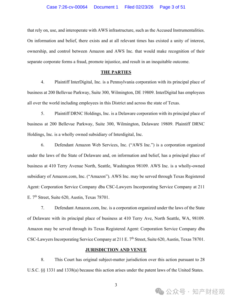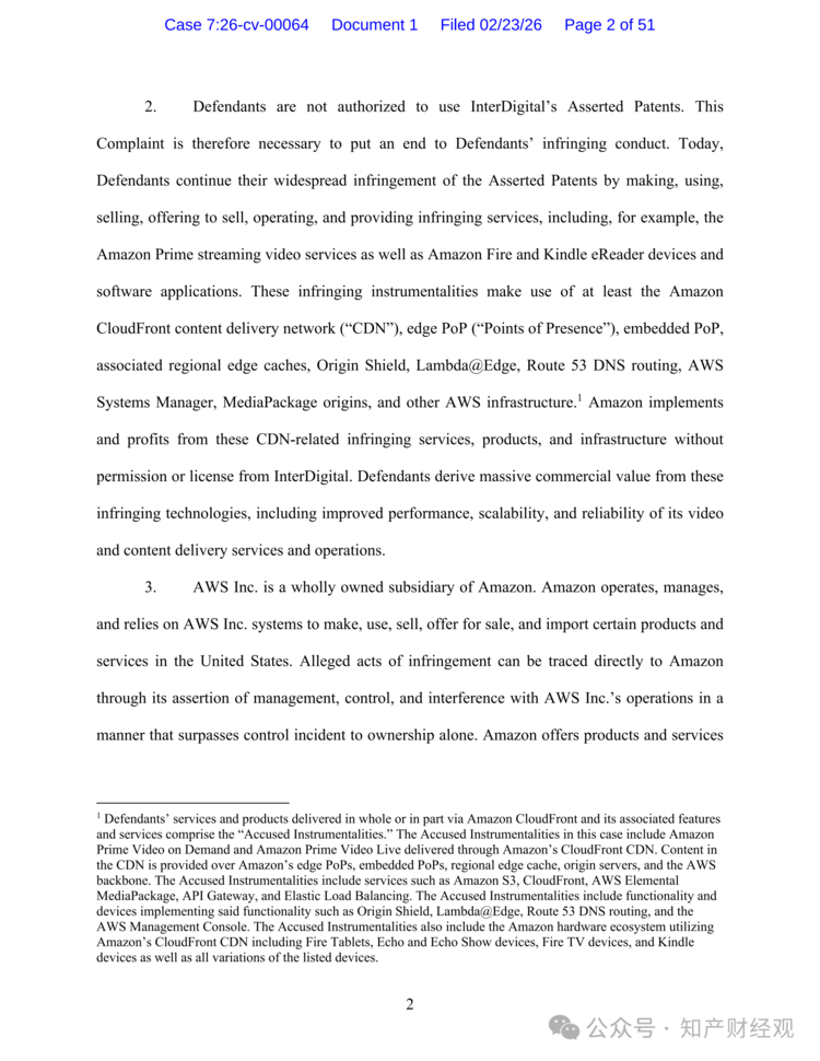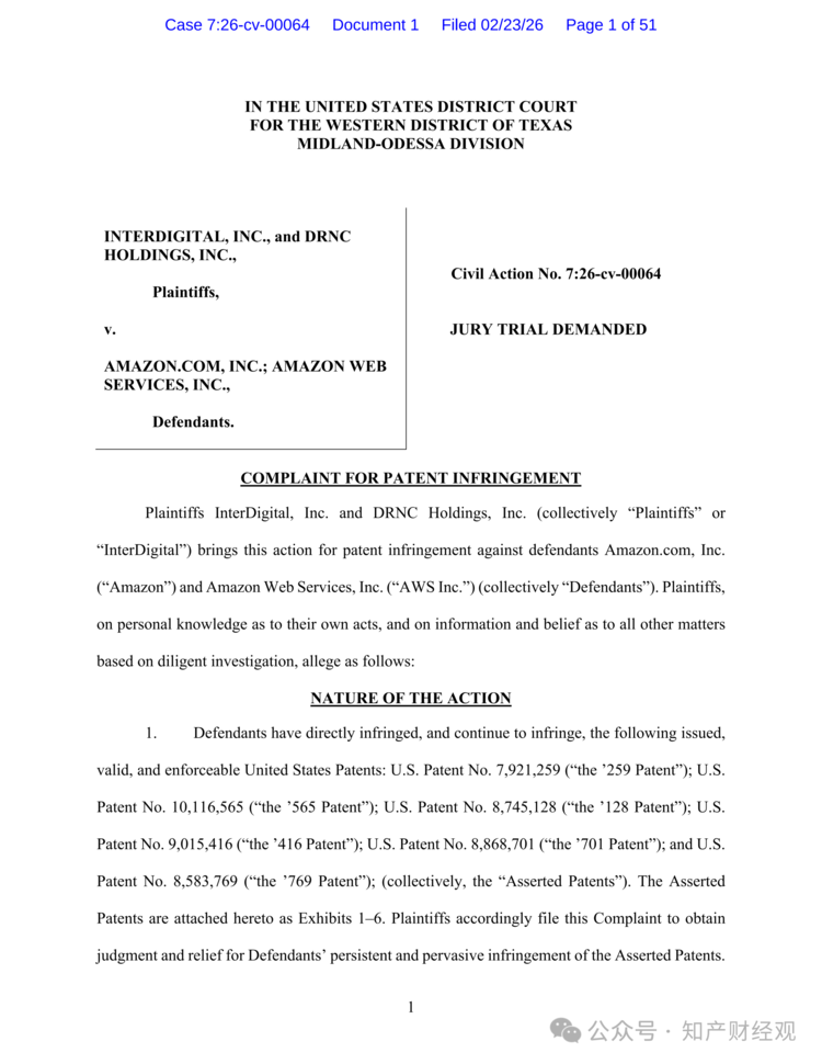 知产财经获悉,2026年2月23日,InterDigital及其子公司DRNC Holdings在美国得克萨斯州西区联邦地区法院提起诉讼,指控Amazon及其子公司Amazon Web Services Inc.侵犯其通过收购获得的多项内容分发网络(CDN)相关专利。