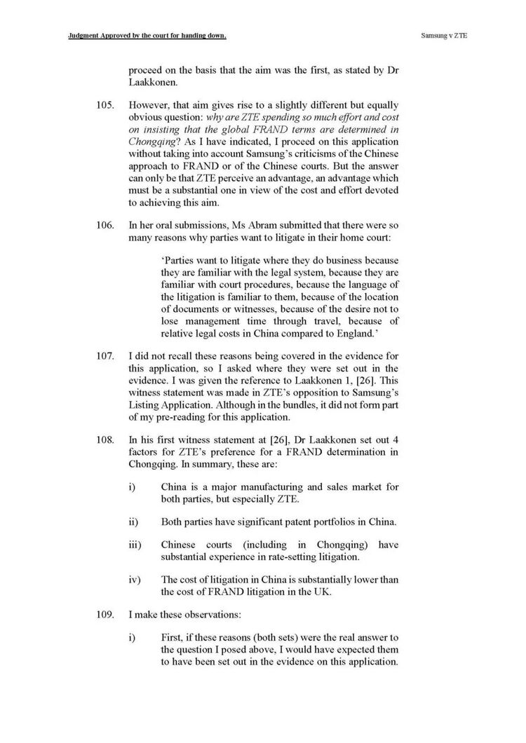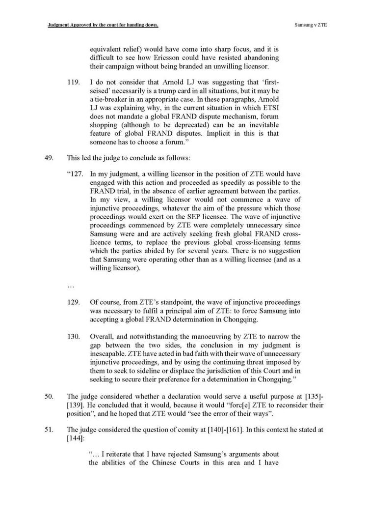 高等法院法官Mellor此前裁定,中兴通过在多国提起禁令诉讼,意图迫使三星接受重庆法院作为FRAND裁决地,构成“恶意”行为,并批准了三星提出的临时许可声明。