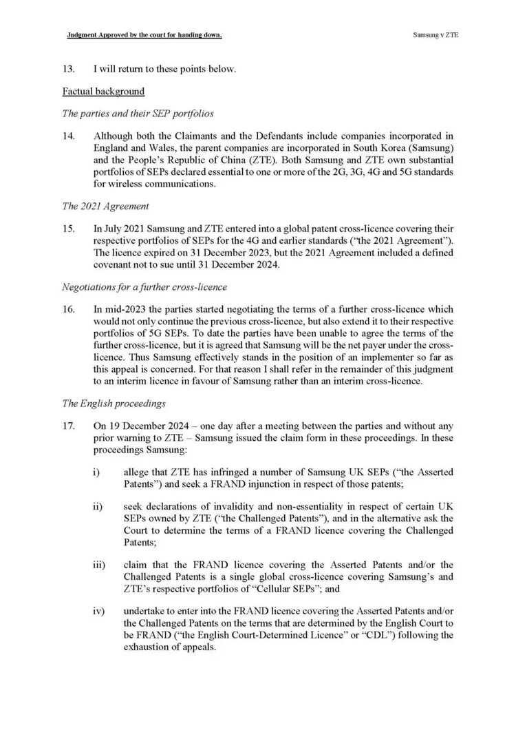 2024年12月19日,三星在英国提起诉讼,寻求FRAND费率裁定及专利侵权救济。