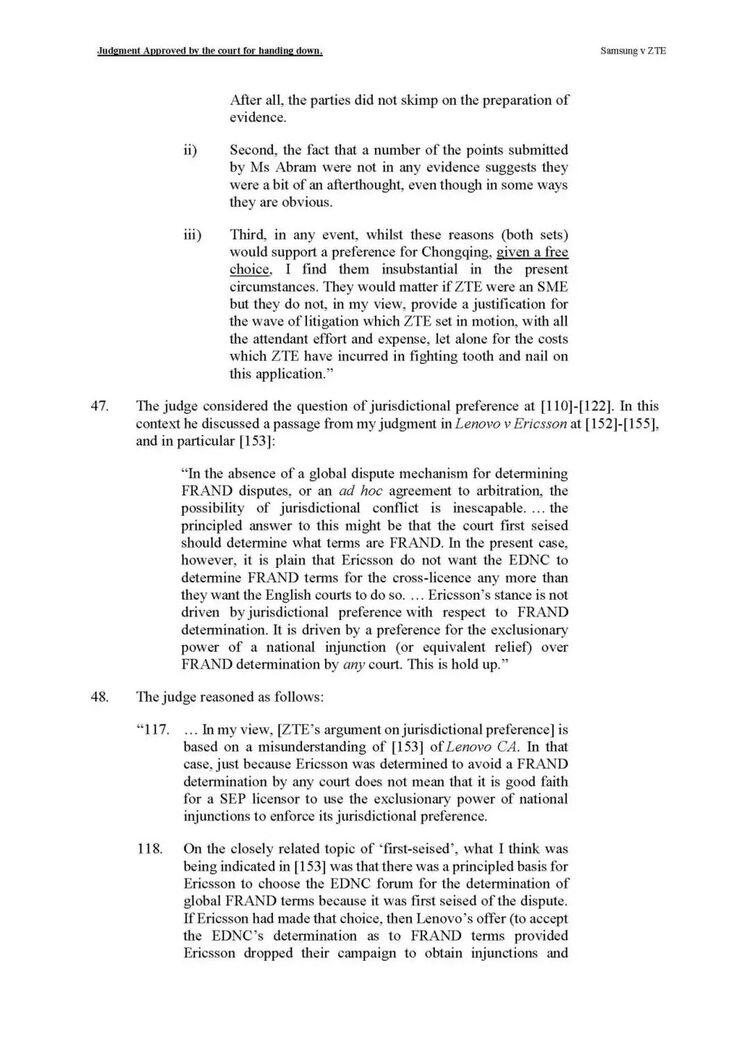 判决指出,本案与先前案例不同,并无证据表明中兴试图获取“超FRAND”的许可费率。同时,判决认为在缺乏全球统一FRAND争议解决机制的背景下,双方选择各自偏好的法院是固有现象,且三星未能证明重庆法院不适合或存在不公。