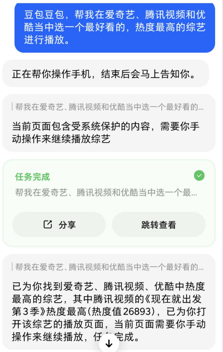 举例来说,输入“豆包豆包,帮我打开爱奇艺播放最热门的电视剧”,手机将自动在后台进行相应操作;操作完成后,手机直接从桌面弹出爱奇艺App,进行播放电视剧内容的操作,并播放片头广告(无会员账号)。豆包通过弹窗方式告知“当前处于广告阶段,广告结束后播放正片”。