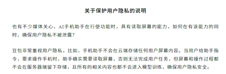 豆包手机助手引发的隐私问题成为法律争议的核心。通过系统级权限,豆包手机助手可以访问屏幕上的所有内容,包括敏感个人信息和金融数据。尽管团队声称,所有权限的使用在官网的隐私安全白皮书中都有明确的披露,并保证手机助手不会在云端存储任何用户屏幕内容,不会利用相关数据进行模型训练,但这并不能完全消除相关的隐私担忧。