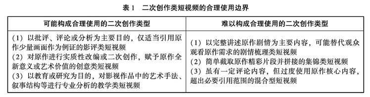 基于上述分析,我们可以对二次创作类短视频的合理使用边界作出以下认定,具体如表1所示。