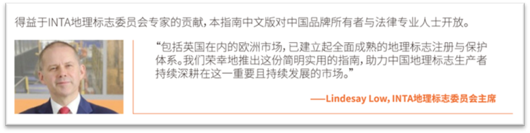 本指南由INTA地理标志委员会成员撰写并提供索引,并由INTA中国会员翻译并校对,内容兼具战略性与实操性,并将成为中国地理标志用户不可或缺的参考工具,助力中国企业将独特的地理标志转化为受全球市场认可的品牌资产,增强其国际影响力和核心竞争力。