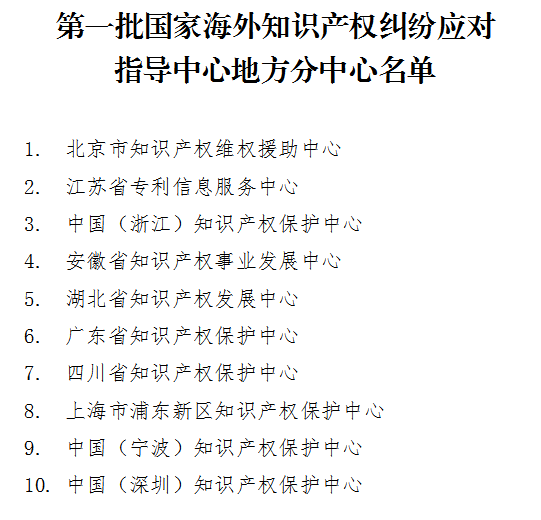 4月8日消息,按照国家海外知识产权纠纷应对指导中心地方分中心建设安排,在各地区申报的基础上,国家知识产权局经研究,同意北京市知识产权维权援助中心等10家单位(名单见附件)设立为第一批国家海外知识产权纠纷应对指导中心地方分中心(下称“地方分中心”)。