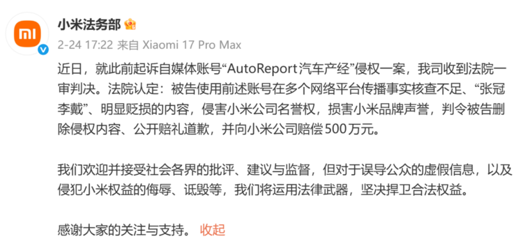 2月24日,小米法务部微博发文称,近日,就此前起诉自媒体账号“AutoReport汽车产经”侵权一案,小米公司已收到法院一审判决。法院在一审判决中认定:被告使用前述自媒体账号在多个网络平台传播事实核查不足、“张冠李戴”、明显贬损的内容,侵害小米公司名誉权,损害小米品牌声誉,判令被告删除侵权内容、公开赔礼道歉,并向小米公司赔偿500万元。