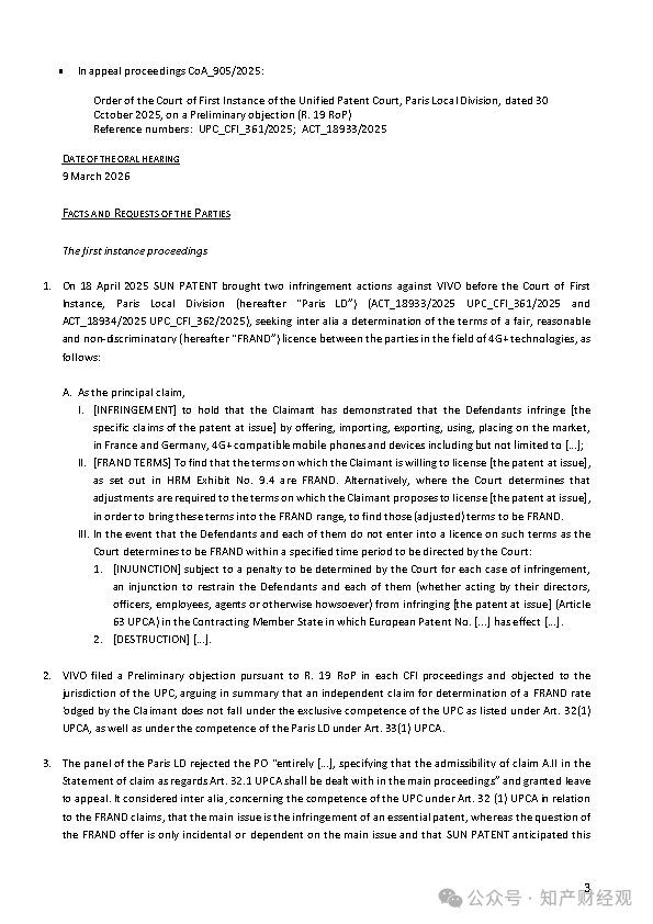 本案起源于2025年4月,Sun Patent Trust就两项欧洲专利(EP 3 407 524、EP 3 852 468)在UPC巴黎地方分庭对Vivo提起侵权诉讼,主张其4G+相关标准必要专利遭到侵害,并请求法院确认其提出的许可条件符合“公平、合理、无歧视”(FRAND)原则,同时在被告拒绝接受相关许可条件的情况下申请禁令救济。
