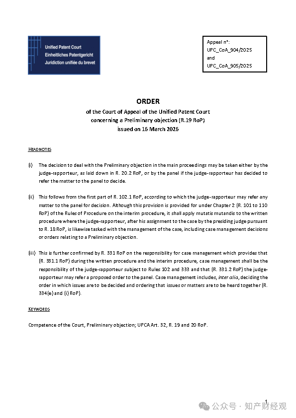 对此,UPC上诉法院明确指出,根据《程序规则》第102条及第331条,承办法官有权将相关事项提交合议庭决定,合议庭亦可作出案件管理性裁定,包括决定不同争点的审理顺序。因此,由合议庭决定将初步异议并入实体审理,并不存在程序违法。