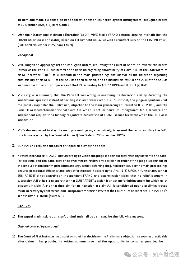 针对上述指控,Vivo依据UPC《程序规则》第19条提出初步异议,主张原告提出的FRAND许可条款确定请求属于独立请求,不属于《统一专利法院协定》(UPCA)第32条规定的专属管辖范围,UPC无权审理。巴黎地方分庭于2025年10月裁定驳回该初步异议,并决定将FRAND条款请求的可受理性问题留待实体程序中一并处理,同时准许上诉。