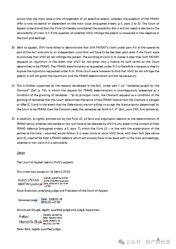 2026年3月16日,UPC上诉法院作出终审裁定:驳回Vivo的全部上诉请求,维持一审巴黎地方分庭的裁定,确认FRAND相关可受理性问题并入实体程序审理,明确 UPC 合议庭有权作出该案件管理决定,且FRAND诉求为侵权主张的附随问题而非独立请求。