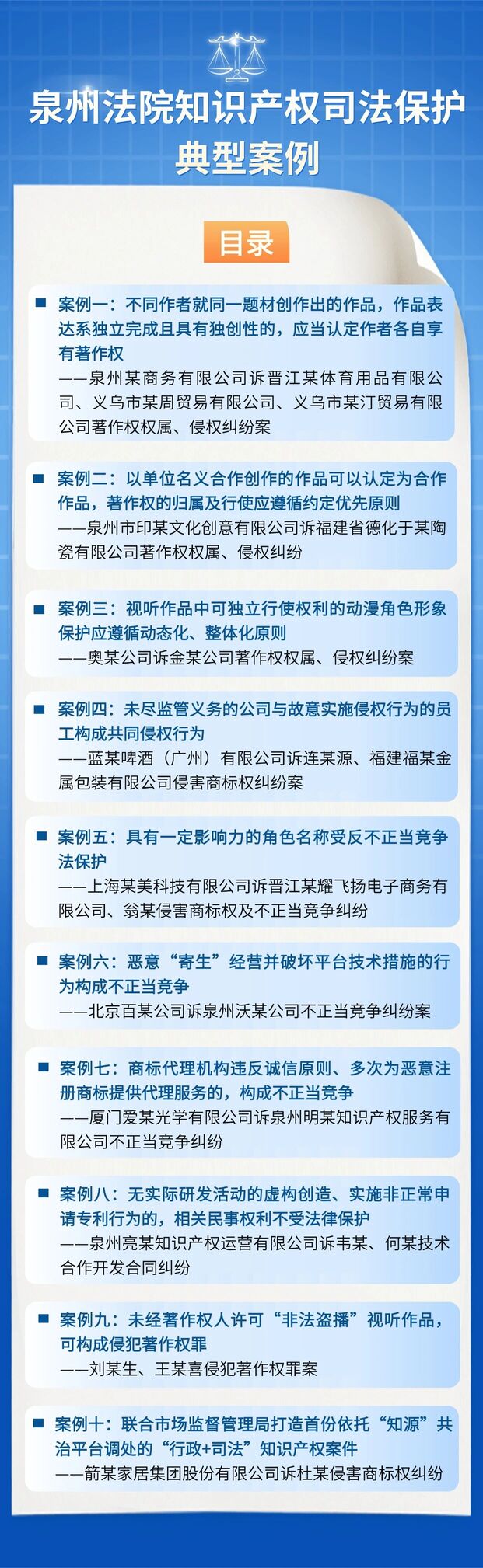在知识产权宣传周之际,泉州中院发布2025年泉州法院知识产权司法保护典型案例,旨在树立价值导向,严格守护原创成果,依法保护权利人合法权益,引导市场主体尊重原创、诚信守法,助力营造良好营商环境。